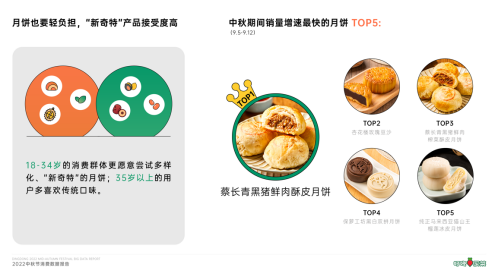 晶灵卖菜数据表明,现在35岁以上的年纪社会群体的使用者大多坚持金针菜、红豆等现代口味的月饼,而年纪在18岁-34岁的消费需求社会群体更愿意尝试多样化、“姚学甲”的月饼,同时会更加注重加醋、少糖、少添加等条件,以减低吃这类“碳水炸弹”的心理经济负担。