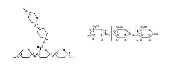 淀粉只不过是由葡萄糖通过相同方式连接后组成的小颗粒。乖巧的葡萄糖会首尾相连的排成一队,它们组成的淀粉被称作直链淀粉。另一类葡萄糖就比较淘气,它们偏不站成一队,而是手拉手的组成一堆分叉,此种淀粉被称作支链淀粉。